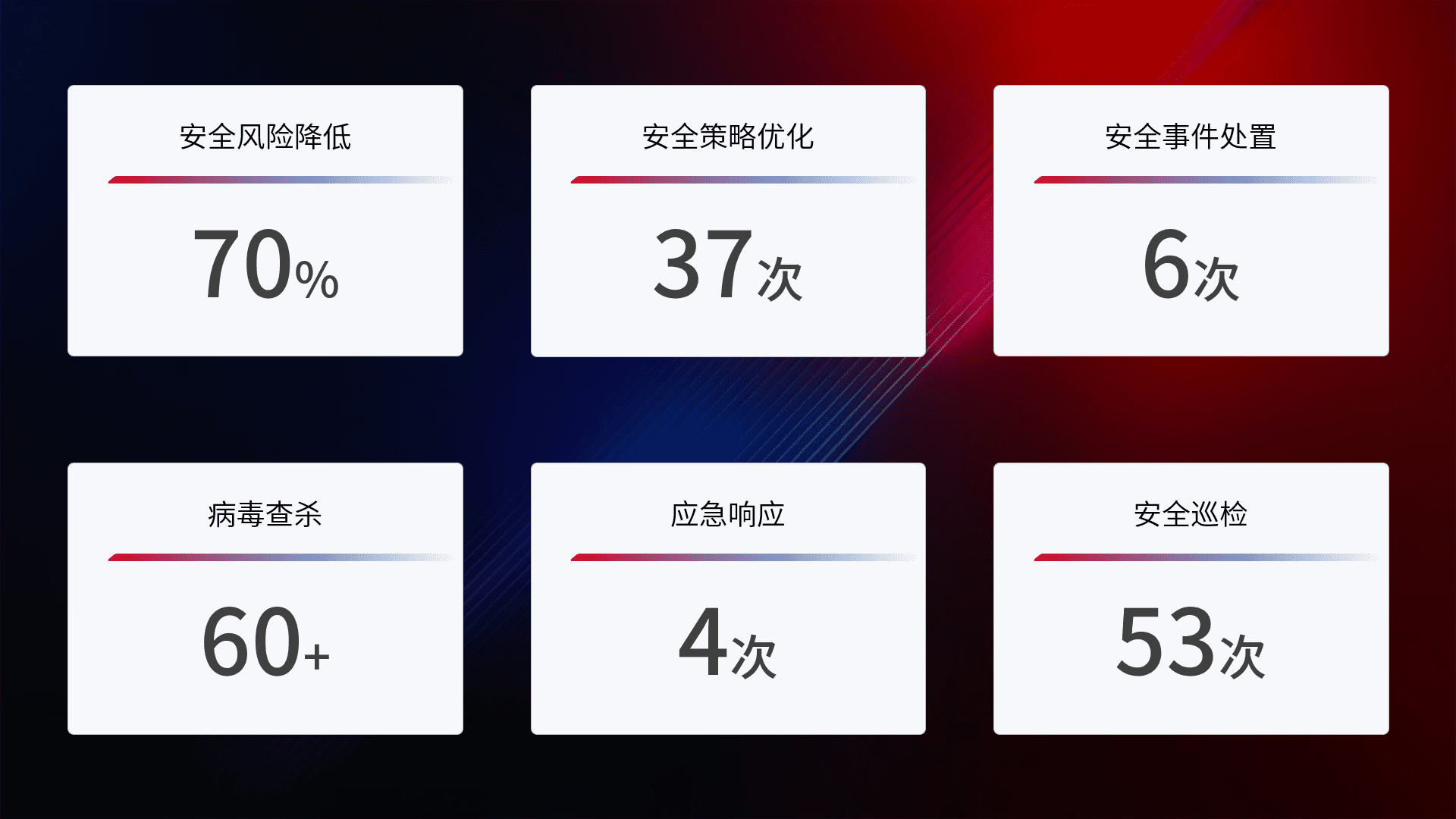 提供全面的安全事件报告体系,,,,包括处置报告、、、周报、、、、季度和年度总结,,,结合持续监控,,帮助客户深入了解网络安全状况。。。